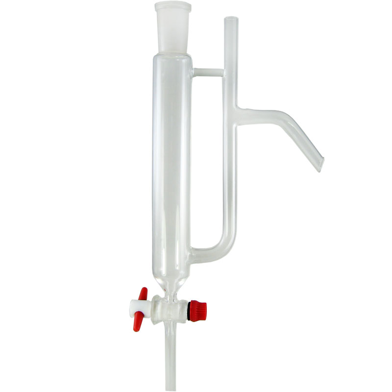 Attach to the bottom of any 24/40 Condenser and prime with water 2" above the valve. This creates a self-contained system that captures essential oils while also venting steam pressure automatically. The essential oil either floats on top or for heavier oils, sinks to the bottom of the column. Excess water from the center of the vessel drips away off the side. When the distillation is complete, the PTFE valve is opened and the water and oil is drained and separated into appropriate bottles.