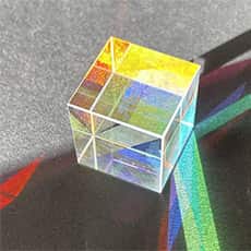 The Beam Splitter Dichroic Glass X-Cube is a 0.75 inch square glass cube made of several lab-grade glass prisms with special optical filtering coatings. Catch the light on it just right, and it fills with a vibrant rainbow of color! This isn’t just a prism, either. Each of its faces illuminates in a distinct color, and the colors even change when you look through different sides!